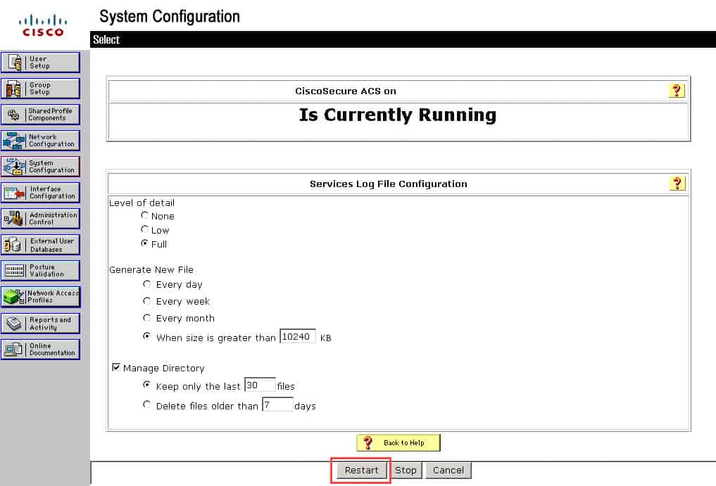 6.ทำการ Restart ACS โดยเลือกเมนู System Configuration > Service Control และกดปุ่ม Restart