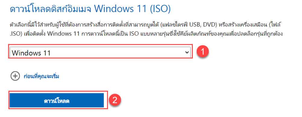 2.เลื่อนลงมาตรง ดาวน์โหลดดิสก์อิมเมจ Windows 11 (ISO) เลือก Windows 11 และกดปุ่ม ดาวน์โหลด